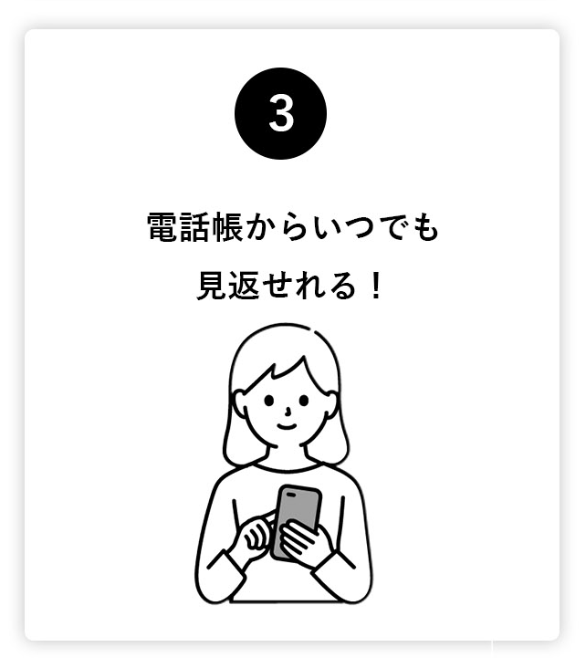 アプリも不要!必ずどのスマホにも備わっている「電話帳」に保存ができます。会った日付やその人の特徴をメモして保存すると、電話帳検索で検索することも可能です。HPのURLもあるのでいつでもその人のページが見れます!